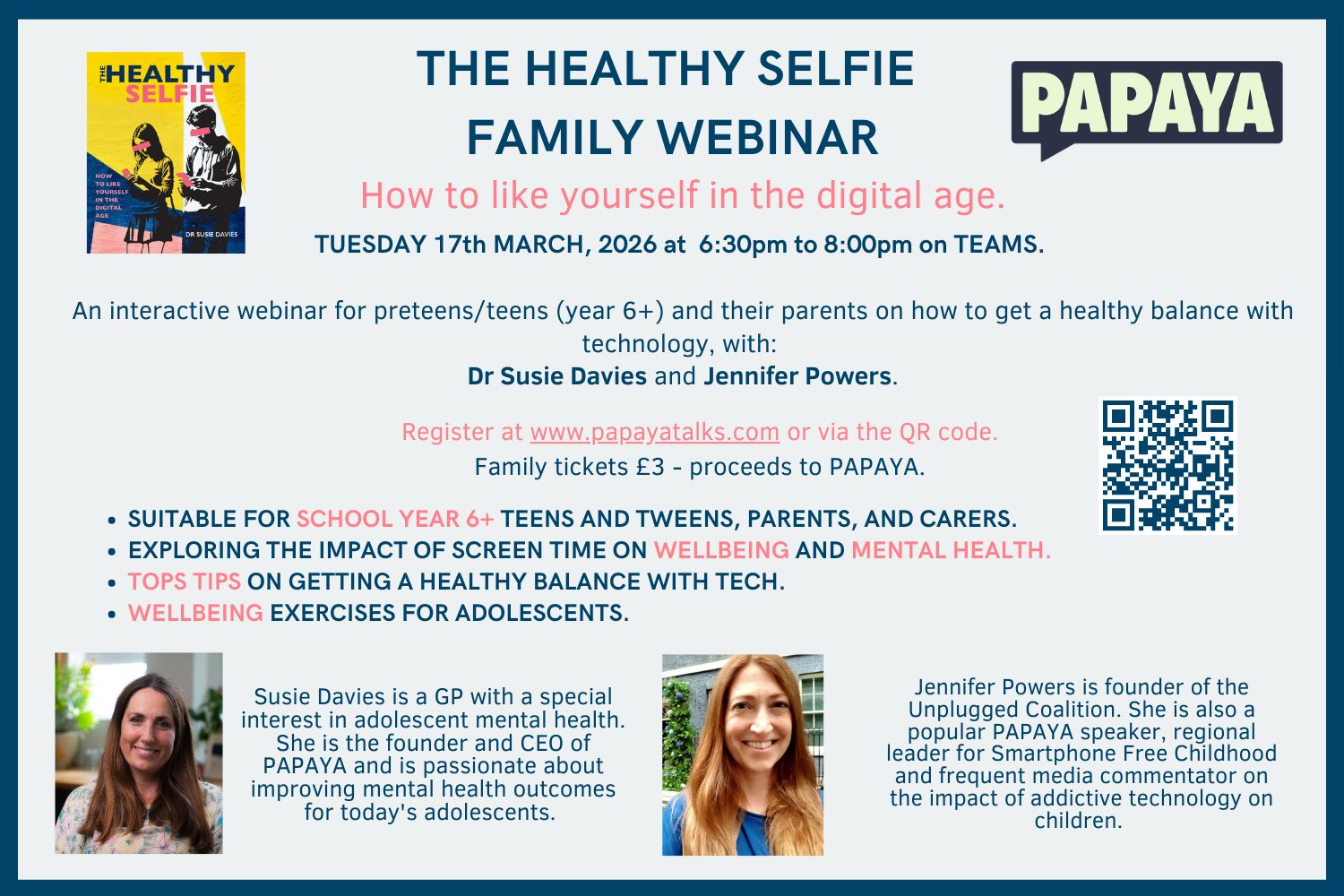 Join Dr. Susie Davies and Jennifer Powers on Tuesday, 17th March 2026, from 6:30pm to 8:00pm for this interactive session designed specifically for teens and tweens (Year 6+) alongside their parents and carers. Together, we will navigate the impact of screen time on wellbeing and share practical "top tips" for achieving a healthy tech balance. To ensure a private environment for families to engage freely the webinar will not be recorded, so please do join us live! Family tickets are £3.